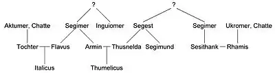 - De même, le propre frère de Segemer se nommait Segestes. Selon Strabon, Géographie [détail des éditions] [lire en ligne] (VII.1.4), ce dernier avait un fils répondant au nom de Segimuntus (que Tacite écrit Segimundus).