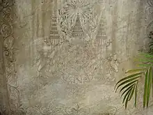 | Écu | D'azur à deux rameaux d'olivier agrafés de l'ordre royal du Cambodge et contenant deux coupes d'or, superposées l'une sur l'autre ; sur la plus haute, une épée d'or surmontée par la version cambodgienne du symbole Om̐. |
