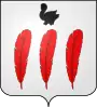 Famille Davignon D'argent à trois plumes de gueules, rangées en pointe, surmontées d'une merlette de sable.[38]