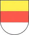Parti : en 1 d'argent à la croix de sable, et en 2 d'or à deux fasces de gueules  |