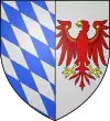 parti fuselé en bande d'azur et d'argent et d'argent à l'aigle de gueules armé, becqué et langué d'or[18]. Différences entre dessin et blasonnement.