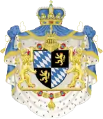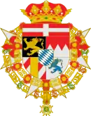 parti de sable au lion d'or contourné armé, couronné et lampassé de gueules (Palatinat du Rhin, contourné) et fuselé en bande d'azur et d'or (Wittelsbach), enté en pointe de gueules à l'orbe crucifère d'or (dignité d'archisénéchal d'Empire)[9]. |