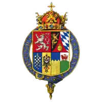 écartelé en 1 et 4 de sable, au lion d'or, armé, lampassé et couronné de gueules (Palatin) et en 2 et 3 fuselé en bande d'azur et d'argent (Bavière).[9].