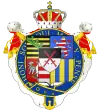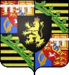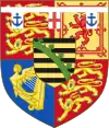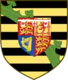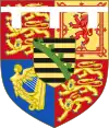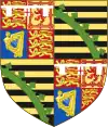 Écartelé : I et IV de gueules à trois léopards d'or armés et lampassés d'azur (d'Angleterre) ; II d'or, au lion de gueules, au double trescheur fleuronné et contre-fleuronné du même (d'Écosse) ; III d'azur, à la harpe d'or, cordée d'argent (d'Irlande) ; au lambel à trois pendants d'argent brochant, celui en cœur chargé d'une rose de gueules (dite de Saint Georges), les deux autres chargés d'une moucheture d'hermine de sable ; sur-le-tout burelé de dix pièces de sable et d'or au crancelin de sinople, brochant en bande sur le tout (de Saxe)[13]. |