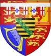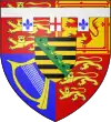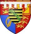 Écartelé : I et IV de gueules à trois léopards d'or armés et lampassés d'azur (d'Angleterre) ; II d'or, au lion de gueules, au double trescheur fleuronné et contre-fleuronné du même (d'Écosse) ; III d'azur, à la harpe d'or, cordée d'argent (d'Irlande) ; au lambel à cinq pendants d'argent brochant, ceux à dextre et sénèstre chargés d'une croix de gueules (dite de Saint Georges), les autres chargés d'une fleur-de-lys d'azur ; sur-le-tout burelé de dix pièces de sable et d'or au crancelin de sinople, brochant en bande sur le tout (de Saxe)[13]. |