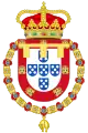 Ferdinand II (1816 † 1885), le roi consort (1837-1853) de Marie II, portait : parti en 1 d'argent à cinq écussons d'azur disposés en croix, chaque écusson chargé de cinq besants d'argent, à la bordure de gueules chargé de sept châteaux d'or et en 2 burelé de sable et d'or, au crancelin de sinople, brochant en bande sur le tout. |