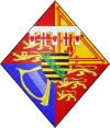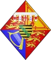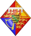 Écartelé : I et IV de gueules à trois léopards d'or armés et lampassés d'azur (d'Angleterre) ; II d'or, au lion de gueules, au double trescheur fleuronné et contre-fleuronné du même (d'Écosse) ; III d'azur, à la harpe d'or, cordée d'argent (d'Irlande) ; au lambel à cinq pendants d'argent brochant, ceux en cœur, à dextre et sénestre chargés d'une croix de gueules (dite « de Saint Georges »), les autres chargés d'un léopard de gueules[13],[14]. Écartelé : I et IV de gueules à trois léopards d'or armés et lampassés d'azur (d'Angleterre) ; II d'or, au lion de gueules, au double trescheur fleuronné et contre-fleuronné du même (d'Écosse) ; III d'azur, à la harpe d'or, cordée d'argent (d'Irlande) ; au lambel à trois pendants d'argent brochant, chacun chargé d'une ancre d'azur[13].