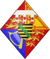 Écartelé : I et IV de gueules à trois léopards d'or armés et lampassés d'azur (d'Angleterre) ; II d'or, au lion de gueules, au double trescheur fleuronné et contre-fleuronné du même (d'Écosse) ; III d'azur, à la harpe d'or, cordée d'argent (d'Irlande) ; au lambel à cinq pendants d'argent brochant, celui en cœur chargé d'une croix de gueules (dite de Saint Georges), ceux à dextre et sénestre chargés d'une fleur-de-lys d'azur, les autres chargés d'un trèfles de sinople ; sur-le-tout burelé de dix pièces de sable et d'or au crancelin de sinople, brochant en bande sur le tout (de Saxe)[13]. Écartelé : I et IV de gueules à trois léopards d'or armés et lampassés d'azur (d'Angleterre) ; II d'or, au lion de gueules, au double trescheur fleuronné et contre-fleuronné du même (d'Écosse) ; III d'azur, à la harpe d'or, cordée d'argent (d'Irlande) ; au lambel à cinq pendants d'argent brochant, ceux en cœur, à dextre et sénestre chargés d'une croix de gueules (dite de Saint Georges), les autres chargés d'une fleur-de-lys d'azur ; sur-le-tout burelé de dix pièces de sable et d'or au crancelin de sinople, brochant en bande sur le tout (de Saxe)[13].