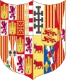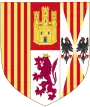 Ferdinand II, roi d'Aragon (1452 † 1516), Ferdinand V, roi de Castille (1474 - 1504) avec Isabelle Ier. 1474 - 1492 : Écartelé en I et IV contre-écartelé en 1 et 4, de gueules au château d'or ouvert et ajouré d'azur et en 2 et 3 d'argent au lion de gueules armé, lampassé et couronné d'or; en II et en III parti, en 1 d'or à quatre pals de gueules et en 2 écartelé en sautoir d'or aux quatre pals de gueules et d'argent à l'aigle de sable 1492 - 1504 : Écartelé en I et IV contre-écartelé en 1 et 4, de gueules au château d'or ouvert et ajouré d'azur et en 2 et 3 d'argent au lion de gueules armé, lampassé et couronné d'or; en II et en III parti, en 1 d'or à quatre pals de gueules et en 2 écartelé en sautoir d'or aux quatre pals de gueules et d'argent à l'aigle de sable, le tout accompagné en pointe d'argent à une pomme grenade de gueules, tigée et feuilleté de sinople[2]. 1504 - 1513 : Écartelé en I et IV contre-écartelé en 1 et 4, de gueules au château d'or ouvert et ajouré d'azur et en 2 et 3 d'argent au lion de gueules armé, lampassé et couronné d'or; en II, parti en 1 d'or à quatre pals de gueules; en 2 parti, en a d'argent à la croix potencé d'or et en b fasce de gueules et d'argent et en III parti, en 1 d'or à quatre pals de gueules et en 2 écartelé en sautoir d'or aux quatre pals de gueules et d'argent à l'aigle de sable, le tout accompagné en pointe d'argent à une pomme grenade de gueules, tigée et feuilleté de sinople[2]. 1513 - 1516 : Écartelé en I et IV contre-écartelé en 1 et 4, de gueules au château d'or ouvert et ajouré d'azur et en 2 et 3 d'argent au lion de gueules armé, lampassé et couronné d'or; en II, parti en 1 coupé d'or à quatre pals de gueules et de gueules aux chaînes d'or posées en orle, en croix et en sautoir, chargées en cœur d'une émeraude au naturel; en 2 parti, en a d'argent à la croix potencé d'or et en b fasce de gueules et d'argent et en III parti, en 1 d'or à quatre pals de gueules et en 2 écartelé en sautoir d'or aux quatre pals de gueules et d'argent à l'aigle de sable, le tout accompagné en pointe d'argent à une pomme grenade de gueules, tigée et feuilleté de sinople[2]. |