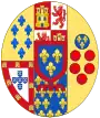 parti de deux, en I coupé d'or aux six fleurs de lys d'azur posées 3, 2 et 1, (qui est de Farnèse) et d'argent, à cinq écussons d'azur, posés en croix, les deux de flanc mis de côté, chaque écusson chargé de cinq besants du champ, posés en sautoir, à la bordure de gueules, chargée de neuf châteaux d'or, donjonnés de trois tours, ouverts et ajourés d'azur (qui est du Portugal), en II coupé écartelé en 1 et 4, de gueules au château d'or ouvert et ajouré d'azur (qui est de Castille) et en 2 et 3 d'argent au lion de gueules armé, lampassé et couronné d'or (qui est deon) et d'azur semé de fleurs de lys d'or au lambel de gueules (qui est de Naples) et en III d'or à six tourteaux mis en orle, cinq de gueules, celui en chef d'azur chargé de trois fleurs de lis d'or (qui est de Toscane) ; sur le tout d'azur, à trois fleurs de lys d'or, à la bordure de gueules, (qui est d'Anjou)[45]. |