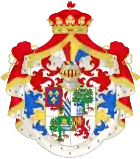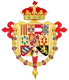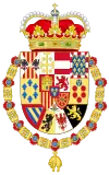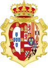 parti en I, d'argent à cinq écussons d'azur en croix, chargés chacun de cinq besants en sautoir, le tout augmenté d'une bordure de gueules à sept châteaux d'or ouverts d'azu (de Portugal) ; en II coupé : en chef parti en 1 écartelé en 1 et 4, de gueules au château d'or ouvert et ajouré d'azur et en 2 et 3 d'argent au lion de gueules armé, lampassé et couronné d'or enté en pointe d'argent à une pomme grenade de gueules, tigée et feuilleté de sinople; 2 parti en 1 d'or à quatre pals de gueules et en 2 écartelé en sautoir d'or aux quatre pals de gueules et d'argent à l'aigle de sable;II, tigée et feuilleté de sinople et en pointe écartelé en 1 de gueules à la fasce d'argent; 2, d'azur semé de fleurs de lys d'or à la bande componée d'argent et de gueules, en 3 bandé d'or et d'azur de six pièces, à la bordure de gueules 4, de sable au lion d'or, armé et lampassé de gueules; enté en pointe parti d'or au lion de sable armé, couronné et lampassé de gueules et d'argent à l'aigle éployé de gueules, membré et becqué d'or;sur le tout d'azur à trois fleurs de lys d'or à la bordure de gueules[29]. coupé de deux : en I, d'argent à cinq écussons d'azur en croix, chargés chacun de cinq besants en sautoir, le tout augmenté d'une bordure de gueules à sept châteaux d'or ouverts d'azu (de Portugal) ; en II, coupé : en chef parti en 1 écartelé en 1 et 4, de gueules au château d'or ouvert et ajouré d'azur et en 2 et 3 d'argent au lion de gueules armé, lampassé et couronné d'or enté en pointe d'argent à une pomme grenade de gueules, tigée et feuilleté de sinople; 2 parti en 1 d'or à quatre pals de gueules et en 2 écartelé en sautoir d'or aux quatre pals de gueules et d'argent à l'aigle de sable;II, tigée et feuilleté de sinople et en pointe écartelé en 1 de gueules à la fasce d'argent; 2, d'azur semé de fleurs de lys d'or à la bande componée d'argent et de gueules, en 3 bandé d'or et d'azur de six pièces, à la bordure de gueules 4, de sable au lion d'or, armé et lampassé de gueules; enté en pointe parti d'or au lion de sable armé, couronné et lampassé de gueules et d'argent à l'aigle éployé de gueules, membré et becqué d'or;sur le tout d'azur à trois fleurs de lys d'or à la bordure de gueules[30]. |