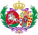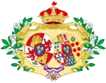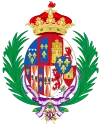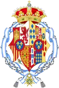 coupé de deux : en I, celui de Bourbon-Sicile (Parti de deux, au I, écartelé : 1 et 4, d'or aux six fleurs de lys d'azur posées 3, 2 et 1 ; 2 et 3, parti de gueules à la fasce d'argent et bandé d'or et d'argent de six pièces à la bordure de gueules ; sur-le-tout d'argent aux cinq écussons disposés en croix d'azur chargés de cinq besans d'argent en sautoir à la bordure de gueules chargée de huit châteaux d'or, donjonnés de trois tours, ouverts et ajourés d'azur ; au II, coupé de 3, au I parti d'écartélé au 1 et 4 de gueules au château d'or, donjonnés de trois tours, ouverts et ajourés d'azur et au 2 et 3 d'argent au lion de pourpre ; et contre-parti d'or aux quatre pals de gueules et écartelé en sautoir d'or aux quatre pals de gueules et d'argent à l'aigle de sable ; enté en pointe d'argent à une pomme grenade de gueules tigée et feuillée de sinople ; au II parti de gueules à la fasce d'argent et d'azur semé de lys d'or à la bordure componée de gueules et d'argent, au III écartélé en 1 taillé d'argent de six pièces à la bordure de gueules et d'or au lion de sable armé et lampassé de gueules au II tranché de sable au lion d'or armé et lampassé de gueules et d'argent à l'aigle de gueules, au 3 semé de lys d'or au lambel de gueules et au 4 d'argent à la croix potencée d'or cantonné de quatre croisettes de même ; au III, d'or à six tourteaux mis en orle, cinq de gueules, celui en chef d'azur chargé de trois fleurs de lis d'or ; sur-le-tout d'azur à trois fleurs de lys d'or posés 2 et 1 à la bordure de gueules ; en II, parti de trois : en 1, d'or à quatre pals de gueules, en 2, écartelé en sautoir d'or aux quatre pals de gueules et d'argent à l'aigle de sable, en 3, de gueules à la fasce d'argent et en 4, d'azur semé de fleurs de lys d'or à la bordure componée d'argent et de gueules ; en II, parti d'or à six fleurs de lys d'azur posées 3, 2 et 1 et d'or à six tourteaux mis en orle, cinq de gueules, celui en chef d'azur chargé de trois fleurs de lis d'or ; en III, parti bandé d'or et d'azur de six pièces, à la bordure de gueules et de sable, au lion d'or, armé et lampassé de gueules ; enté en pointe parti d'or, au lion de sable, armé et lampassé de gueules et d'argent à l'aigle éployé de gueules, membré et becqué d'or ; sur-le-tout, écartelé en 1 et 4, de gueules au château d'or ouvert et ajouré d'azur et en 2 et 3 d'argent au lion de gueules armé, lampassé et couronné d'or, enté en pointe du sur-le-tout d'argent à une pomme grenade de gueules, tigée et feuilleté de sinople ; sur-le-tout-du-tout d'azur à trois fleurs de lys d'or à la bordure de gueules. |