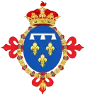 1866[Information douteuse]-1930 : parti en I, écartelé en 1 d'azur aux trois fleurs de lis d'or au lambel d'argent (d'Orléans), en 2 d'azur aux trois fleurs de lys d'or à la bourdure de gueules (d'Anjou) et en 3 et 4 parti en 1 d'azur aux trois fleurs de lys d'or à la bourdure de gueules et 2 écartelé en sautoir d'or aux quatre pals de gueules et d'argent à l'aigle de sable (de Bourbon-Deux Siciles) ; en II écartelé en 1 et 4, de gueules au château d'or ouvert et ajouré d'azur et en 2 et 3 d'argent au lion de gueules armé, lampassé et couronné d'or, enté en pointe du sur-le-tout d'argent à une pomme grenade de gueules, tigée et feuilleté de sinople sur-le-tout d'azur à trois fleurs de lys d'or à la bordure de gueules, après 1883, d'azur à trois fleurs de lys d'or[Information douteuse]. 1930-1958 : écartelé en 1 et 4, de gueules au château d'or ouvert et ajouré d'azur et en 2 et 3 d'argent au lion de gueules armé, lampassé et couronné d'or, enté en pointe du sur-le-tout d'argent à une pomme grenade de gueules, tigée et feuilleté de sinople sur-le-tout d'azur à trois fleurs de lys d'or[Information douteuse]. |