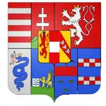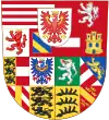 d'or, à l'aigle bicéphale de sable, membrée, becquée et liée de gueules ; sur le tout écartelé, en 1 de gueules, au lion d'argent à la queue fourchée passée en sautoir, couronné, armé et lampassé d'or, en 2 fascé d'argent et de gueules, en 3 parti de gueules à la fasce d'argent et bandé d'or et d'azur en six pièces à la bordure de gueules et en 4 écartelé en 1 et 4 de gueules au château d'or et en 2 et 3 d'argent au lion de gueules armé lampassé et couronné d'or[1]. et les grandes armes pour Rudolphe II, Matthias and Ferdinand II, Holy Roman Emperors.svg |