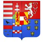 |  | François Ferdinand de Habsbourg (20 novembre  1912  – ), archiduc d'Autriche-Este écartelé en 1 parti fascé d'argent et de gueules de huit pièces et de gueules, à la croix patriarcale pattée d'argent, issante d'une couronne d'argent, plantée au sommet d'un mont de trois coupeaux de sinople, en 2 de gueules au lion d'argent à la queue fourchée passée en sautoir, couronné, armé et lampassé d'or, en 3 parti d'azur, à la fasce cousue de gueules, accompagnée en chef d'un corbeau de sable et en pointe de trois couronnes d'or et de Lodomérie et en 4 d'azur, à cinq aigles d'or (2, 2 et 1), becquées, languées et membrées de gueules, sur le tout parti en 1 tiercé en pal d'or au lion de gueules armé, lampassé et couronné d'azur, de gueules à la fasce d'argent et d'or à la bande de gueules chargé de trois alérions d'argent, et en 2 d'azur, à l'aigle d'argent, becquée, languée et couronnée d'or[10].