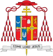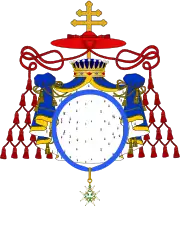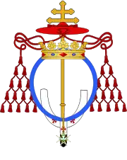 Cardinal-évêque (ou plus généralement cardinaux qui sont évêques) | Les cardinaux qui sont évêques ajoutent une croix de procession d'or derrière leur écu[1].
