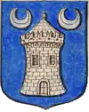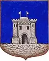 De gueules au lion d'or, surmonté de trois tours d'argent. |