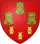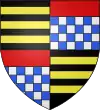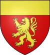 Parti : au 1 d'argent, au chevron de gueules, chargé de trois fleurs de lys d'or ; au 2 d'azur au lion d'or, couronné de même, lampassé et armé de gueules.[29] |