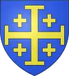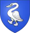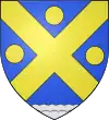 D'azur, au sautoir d'or, accompagné de trois besants du même, un en chef, deux en flancs, et en pointe une rivière ondée d'argent.[1] |