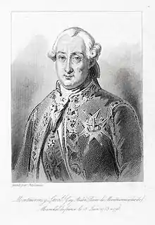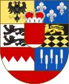 Ecartelé : aux I et IV, de gueules semés de trèfles d'or, à deux bars adossés de même (Clermont-en-Beauvaisis) ; aux II et III, bandé d'or et de gueules ; au franc-quartier d'or chargé d'une croix de gueules cantonnée de seize alérions d'azur, le franc-quartier lui-même cantonné d'un franc-quartier d'argent à une molette de sable.[14] | |