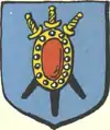 d'azur à trois épées de sable, montées d'or, posées en pal et en sautoir, à un bouclier ovale de gueules, bordé d'or et clouté d'argent, brochant sur le tout.[1] |