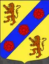 d'or à une barre d'azur chargée de trois roses de gueules et accompagnée de deux lions au naturel.[2] |