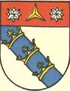 d'azur à deux chevrons d'or accompagnés en chef d'une croisette du même, en pointe d'un lion d'or issant armé et lampassé de gueules. (Il s'agissait auparavant d'un seul chevron croiseté)[12] |