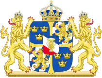 Écartelé à la croix pattée d'or, qui est la Croix de Saint-Eric, cantonnée en 1 et 4, d'azur à trois couronnes d'or posées 2 et 1 qui est de Suède moderne, en 2 et 3, d'azur, à trois barres ondées d'argent, au lion couronné d'or armé et lampassé de gueules, brochant sur le tout, qui est de Suède ancien, sur le tout, tranché d'azur et de gueules à la banche d'argent et à la gerbe d'or brochant sur le tout qui est de Vasa[18].