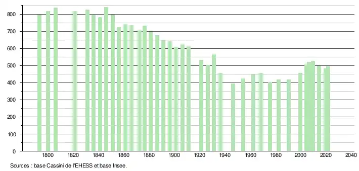 - Population municipale légale en vigueur au 1er janvier 2024, millésimée 2021, définie dans les limites territoriales en vigueur au 1er janvier 2023, date de référence statistique : 1er janvier 2021.