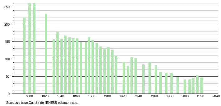 L'évolution du nombre d'habitants est connue à travers les recensements de la population effectués dans la commune depuis 1793. Pour les communes de moins de 10 000 habitants, une enquête de recensement portant sur toute la population est réalisée tous les cinq ans, les populations légales des années intermédiaires étant quant à elles estimées par interpolation ou extrapolation[15]. Pour la commune, le premier recensement exhaustif entrant dans le cadre du nouveau dispositif a été réalisé en 2005[16].