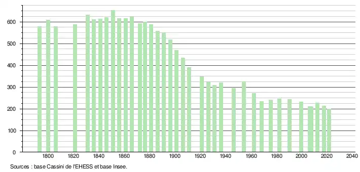 L'évolution du nombre d'habitants est connue à travers les recensements de la population effectués dans la commune depuis 1793. Pour les communes de moins de 10 000 habitants, une enquête de recensement portant sur toute la population est réalisée tous les cinq ans, les populations légales des années intermédiaires étant quant à elles estimées par interpolation ou extrapolation[37]. Pour la commune, le premier recensement exhaustif entrant dans le cadre du nouveau dispositif a été réalisé en 2007[38].