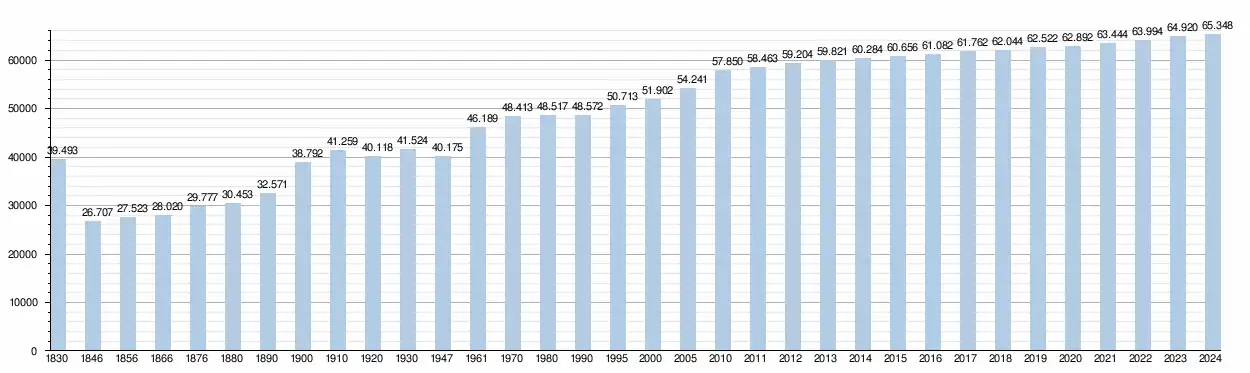 Il comptait, au , 66 388 habitants (33 313 hommes et 33 075 femmes), soit une densité de 209,24 habitants/km2[2] pour une superficie de 317,28 km2.