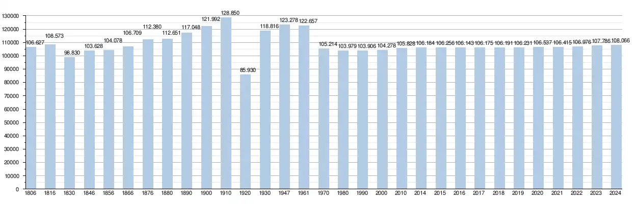 Il comptait, au , 108 568 habitants (54 365 hommes et 54 203 femmes), soit une densité de 197,53 habitants/km²[2] pour une superficie de 549,62 km².