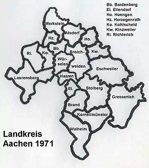 Sur les plus de vingt communes initiales, seules cinq restent au-delà du 1er janvier 1972 : Alsdorf, Eschweiler, Herzogenrath, Stolberg et Würselen.