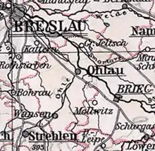 Dans la principauté de Brieg, l'une des sous-principautés silésiennes, les cinq arrondissements prussiens d'Ohlau, Brieg (de), Kreuzburg (de), Strehlen et Nimptsch sont formés à partir d'anciennes faubourgs silésiens. Ernst Friedrich von Berge-Herrendorf est nommé premier administrateur de l'arrondissement d'Ohlau[3],[4]. L'arrondissement d'Ohlau est subordonné à la Chambre de guerre et de domaine de Breslau jusqu'à ce qu'il soit affecté au district de Reichenbach dans la province de Silésie au cours des réformes Stein-Hardenberg en 1815[5]