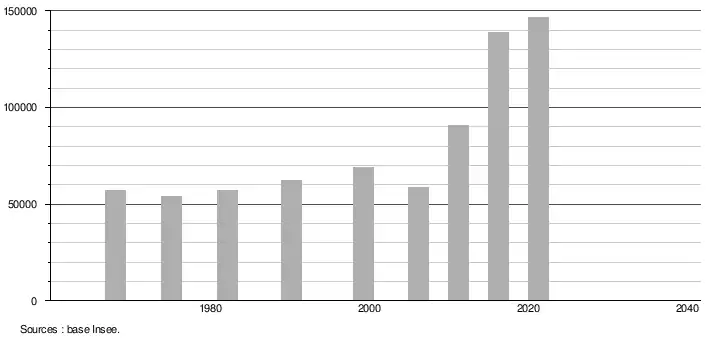 - Population municipale légale en vigueur au 1er janvier 2024, millésimée 2021, définie dans les limites territoriales en vigueur au 1er janvier 2023, date de référence statistique : 1er janvier 2021.