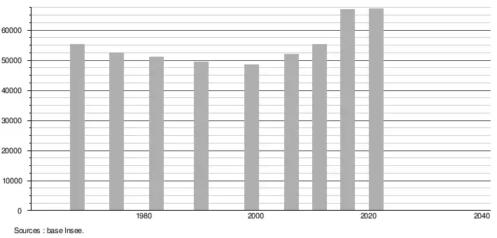 - Population municipale légale en vigueur au 1er janvier 2024, millésimée 2021, définie dans les limites territoriales en vigueur au 1er janvier 2023, date de référence statistique : 1er janvier 2021.