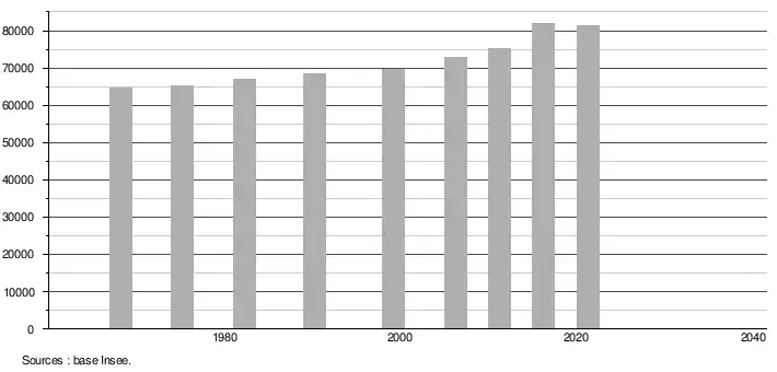 - Population municipale légale en vigueur au 1er janvier 2024, millésimée 2021, définie dans les limites territoriales en vigueur au 1er janvier 2023, date de référence statistique : 1er janvier 2021.