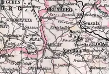 Après la conquête de la majeure partie de la Silésie par la Prusse en 1741, les structures administratives prussiennes sont introduites en Basse-Silésie par l'ordre du cabinet royal du [1]. Celles-ci comprennent la création de deux chambres de guerre et de domaine (de) à Breslau et Glogau ainsi que leur division en arrondissements et la nomination d' administrateurs d'arrondissement le [2].