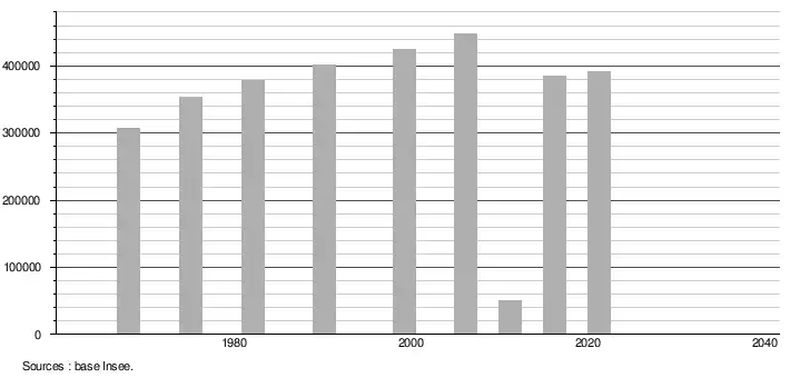 - Population municipale légale en vigueur au 1er janvier 2024, millésimée 2021, définie dans les limites territoriales en vigueur au 1er janvier 2023, date de référence statistique : 1er janvier 2021.