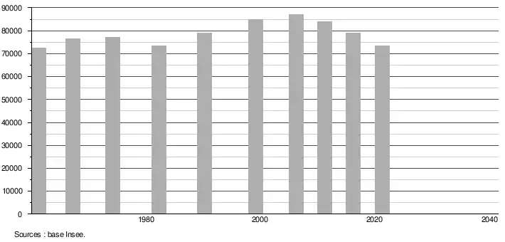 - Population municipale légale en vigueur au 1er janvier 2024, millésimée 2021, définie dans les limites territoriales en vigueur au 1er janvier 2023, date de référence statistique : 1er janvier 2021.
