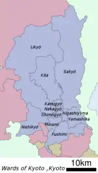 - (en) Cet article est partiellement ou en totalité issu de l’article de Wikipédia en anglais intitulé « Wards of Kyoto » (voir la liste des auteurs).