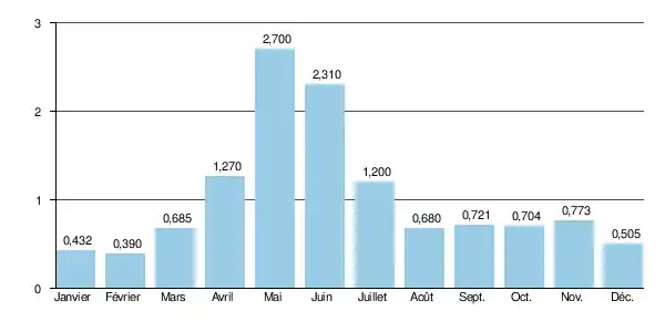 Aux étiages, le VCN3 peut chuter jusque 0,130 m3/s (130 litres/s), en cas de période quinquennale sèche, ce qui est loin d'être sévère et reste tout à fait acceptable.
