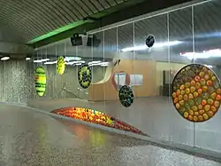 | Peel | Verte | Mousseau, Jean-Paul | Cercles | 1966 | Céramique | Des lunes composées de lamelles de céramique vernissée et vivement colorées sont disposées partout dans la station, tant sur les murs que sur le sol. | ![]() |