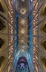 L'architecture gothique repose sur l'utilisation de la voûte sur croisée d'ogives, c'est-à-dire une voûte formée de deux arcs qui se croisent en diagonales, associée à l'arc brisé[2]. Cette technique permet d'alléger la structure porteuse et donc de gagner en élévation ainsi que d'ouvrir plus largement les murs porteurs avec des vitraux colorés. Les supports sont également amincis ce qui souligne les lignes verticales et unifie l'espace. Pour soutenir le poids des voûtes sur croisée d'ogive, les bâtisseurs gothiques ont recours à la technique des arcs-boutants. Un arc-boutant est l'élément d'appui en forme de demi-arc situé à l'extérieur de l'édifice ; il repose sur un contrefort et soutient le mur là où s'exercent les plus fortes poussées des voûtes. Il est surmonté par un pinacle, élément à la fois ornemental et structurel inventé par l'art gothique.