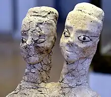 Dès la période néolithique en Jordanie, des figurines et des sculptures ont été réalisées. Dans certains des exemples les plus anciens, des crânes humains étaient construits avec du plâtre et des incrustations étaient utilisées pour les orbites[13]. Deux caches de figurines découvertes à 'Ain Ghazal, près d'Amman, comprennent des modèles d'animaux et quelque trois douzaines de figurines monumentales, dont les chercheurs pensent qu'elles étaient importantes pour le rituel et la structure sociale des peuples qui vivaient là[14], et qu'elles pouvaient faire partie d'un rituel funéraire[15]. Les statues de 'Ain Ghazal sont grandes, certaines mesurant environ un mètre de haut. Ain Ghazal a été occupée entre 7000 et 5000 avant J.-C. et les statues ont été datées d'environ 6500 avant J.-C.[15]. Faisant un usage intensif du plâtre[16], les statues d'Ain Ghazal se démarquent nettement des minuscules figures sans visage de la période paléolithique et marquent l'avènement d'un art néolithique distinct[15].