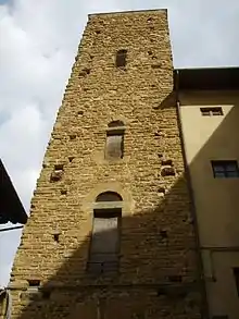 Les structures en encorbellement des tours ont été faites aussi en bois, ainsi que les typiques constructions en projections, où de grandes poutres enfilées dans des trous de boulins soutiennent les ballatoio et bretèches en saillie. En outre, il est connu que le XIIIe siècle est l'ère des maisons-tours et coteries (consorterie), une période de guerre continue entre les membres des factions opposées, qui s'affrontent avec des pierres ou d'autres munitions, parfois avec l'aide de vrais machines de jet positionnées au dessus de la tour.