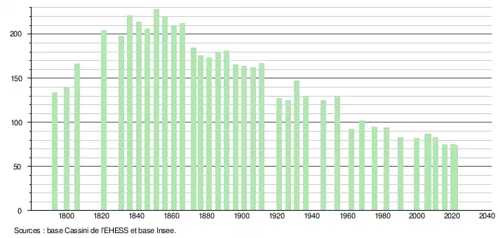 | L'évolution du nombre d'habitants est connue à travers les recensements de la population effectués dans la commune depuis 1793. Pour les communes de moins de 10 000 habitants, une enquête de recensement portant sur toute la population est réalisée tous les cinq ans, les populations légales des années intermédiaires étant quant à elles estimées par interpolation ou extrapolation[37]. Pour la commune, le premier recensement exhaustif entrant dans le cadre du nouveau dispositif a été réalisé en 2005[38]. En 2021, la commune comptait 74 habitants[Note 6], en diminution de 1,33 % par rapport à 2015 (Aude : +2,47 %, France hors Mayotte : +1,84 %). |