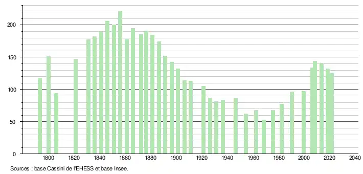 | L'évolution du nombre d'habitants est connue à travers les recensements de la population effectués dans la commune depuis 1793. Pour les communes de moins de 10 000 habitants, une enquête de recensement portant sur toute la population est réalisée tous les cinq ans, les populations légales des années intermédiaires étant quant à elles estimées par interpolation ou extrapolation[23]. Pour la commune, le premier recensement exhaustif entrant dans le cadre du nouveau dispositif a été réalisé en 2008[24]. En 2021, la commune comptait 126 habitants[Note 4], en diminution de 11,89 % par rapport à 2015 (Haute-Garonne : +7,43 %, France hors Mayotte : +1,84 %). |