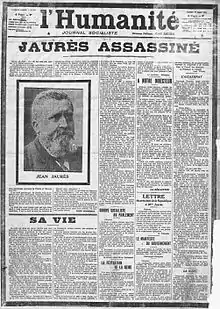 En fin de journée, il se rend au siège de son journal pour préparer un article de mobilisation antiguerre pour l’édition du . Auparavant, il sort dîner au café du Croissant, rue Montmartre, avec ses collaborateurs du journal dont Pierre Renaudel, Jean Longuet, Philippe Landrieu, Ernest Poisson, et Georges Weill. Il est assis dos à la fenêtre ouverte, séparé de la rue par un simple brise-bise. Observant depuis la rue la salle du café où il avait repéré que Jaurès dînait habituellement, caché par le rideau, l’assassin tire deux coups : la première balle pénètre dans la région pariétale de la tête, la seconde va se perdre dans une boiserie entourant une glace[10]. Jaurès est pratiquement tué sur le coup d'une hémorragie cérébrale[11]. Dans la confusion, Madame Poisson, épouse du collaborateur de L'Humanité Ernest Poisson, hurle : « Jaurès est tué ! » Ultérieurement on lui prête l'exclamation « Ils ont tué Jaurès ! » repris dans le monde ouvrier qui déplore « Ils ont tué Jaurès. C'est la guerre ». C'est cette version apocryphe accusant les nationalistes qui a survécu[12].